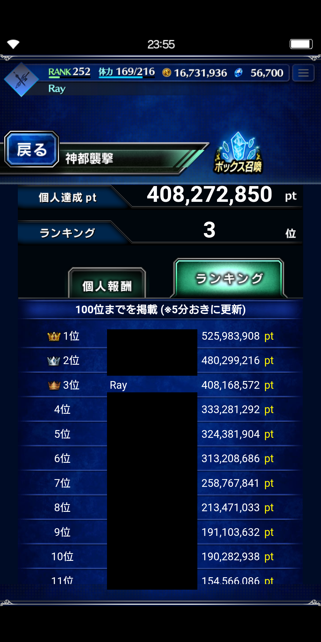 60個くらい残ってしまって使いきれたわけでもないし、たぶんメールボックスに回復薬が100個くらい埋もれてたはずなんですが、それを総動員しても1位の人のポイントは無理…